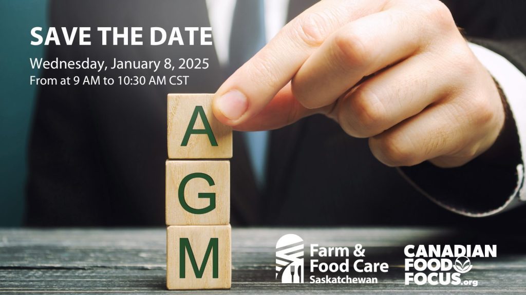 The Farm & Food Care Saskatchewan Annual General Meeting (and Canadian Food Focus meeting) will be online and will take place on Wednesday, January 8, 2025 from 9:00AM to 10:30AM CST. All eligible member organizations (Affiliate, Supporter, Partner, Principal) can designate one voting representative, and may have additional representatives attend.